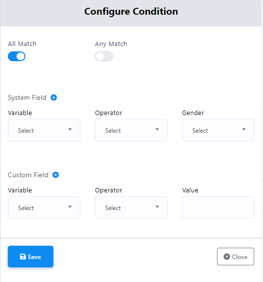 2. Within the Condition component settings, users have the choice of using two radio buttons: `All Match` and `Any Match`. These options dictate whether all specified conditions must be simultaneously met or if any one of them is adequate to initiate a particular action or response.