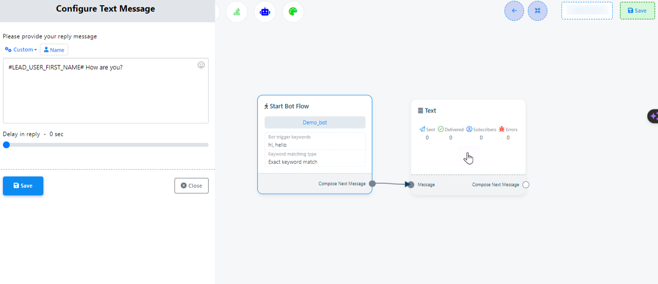 Message Input: In the text field, you can input your reply message. Here, you also have the capability to include dynamic elements like the user`s first name, last name, or custom field variables within the reply message to personalize the interaction.