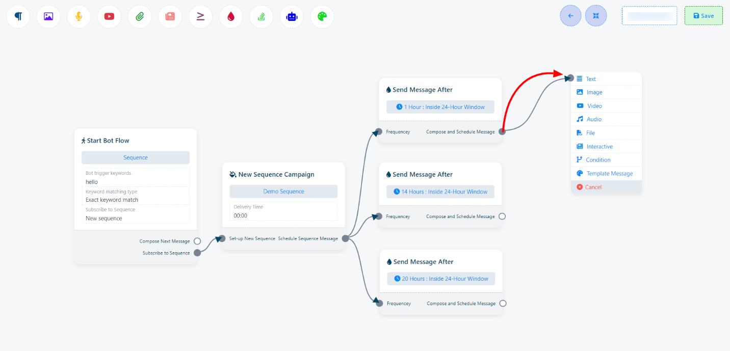 For the `Compose Next Message` socket, you can add text, images, audio, video, or file components and configure them as follows: