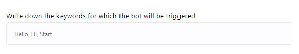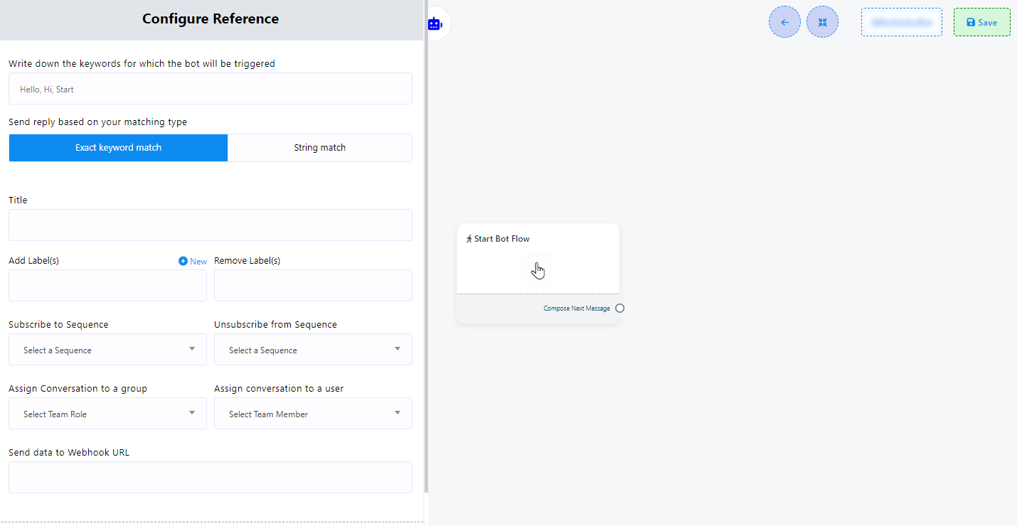 1. Keyword Triggering: To initiate the bot using specific keywords,double-click on the `Start Bot Flow` element. This action will open the `Configure Reference` in the left side, featuring ten fields and two buttons. In the first field, you can input a list of comma-separated keywords. When a user enters text in the messaging window that matches any of these keywords, the bot will be triggered.